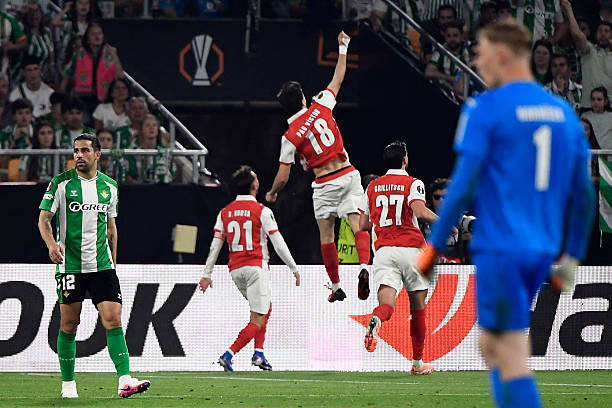 Llegados los 25’ minutos, los bracarenses volverían a ser víctima de la ofensiva bética, poniendo el segundo Abde mediante un remate a placer, tras un buen pase de Fornals desde el lateral del área. Tras anularse un gol a Abde por fuera de juego, la polémica aterrizaría en La Cartuja al 38’, viéndose reflejada en el primer tanto del Braga al rematar Pau Victor a la derecha de la meta después de caer a plomo Llorente en un choque con Bartra.