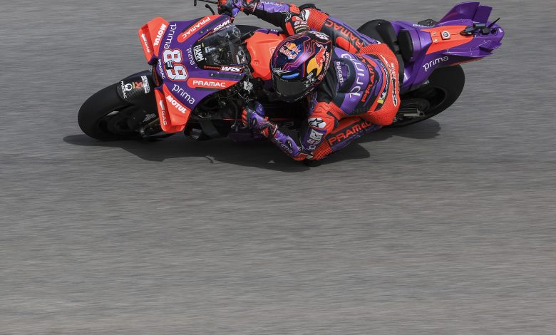Jorge Martín vuelve a avisar a Ducati: 2.01,397 el viernes para romper el récord de la pista en Cota. El líder del Mundial marcó el mejor tiempo 10 minutos antes de terminar la sesión, aunque no se dio el lujo de quedarse en el garaje y volvió a salir para intentar mejorarlo. A pesar de no conseguirlo, ni Viñales, segundo a 76 milésimas, ni Márquez, tercero a 4 décimas, pudieron superarlo.
