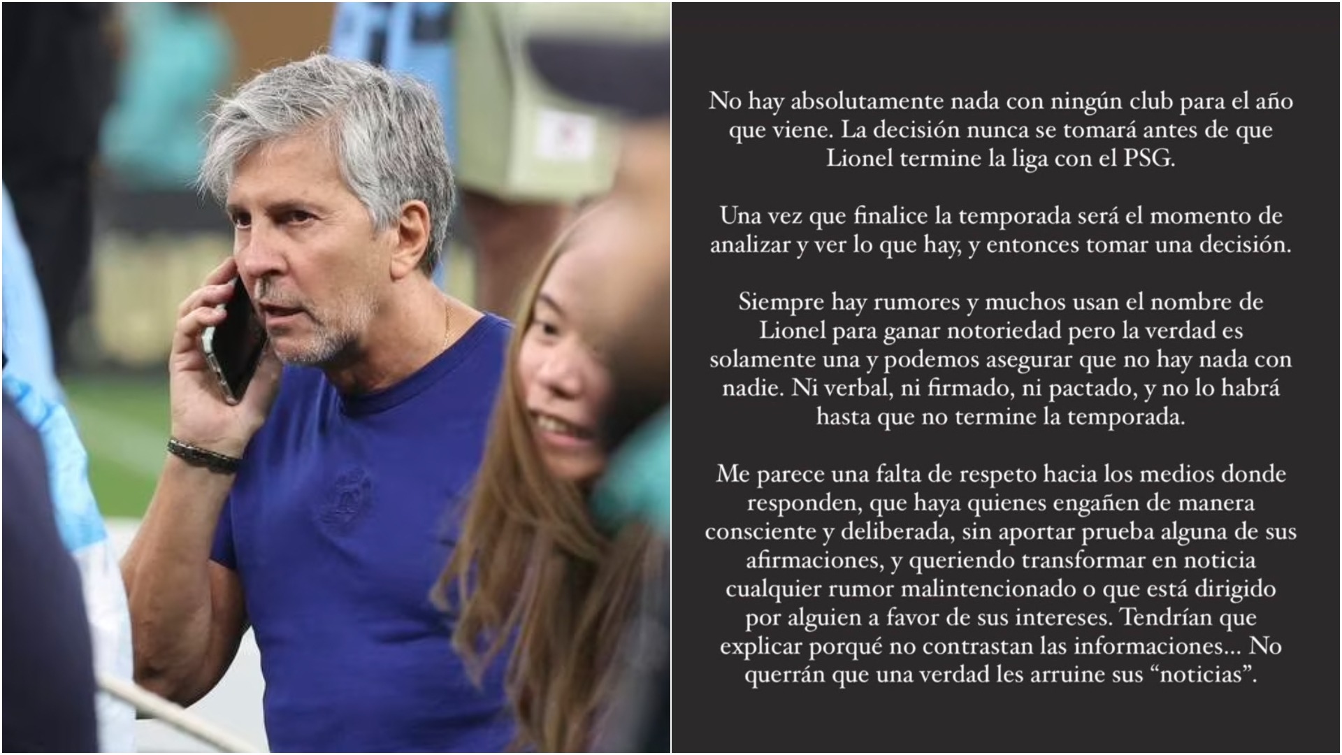 El representante de Leo Messi, su padre Jorge Messi ha desmentido los rumores al rededor de su hijo. El padre ha sido tajante desde la primera línea del comunicado. «No hay absolutamente nada con ningún club para el año que viene». E intenta calmar las aguas parisinas: «La decisión nunca se tomará antes de que Lionel termine la liga con el PSG».